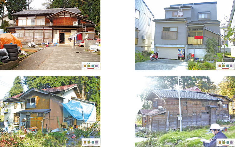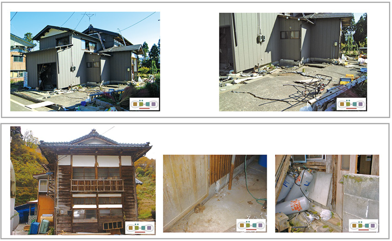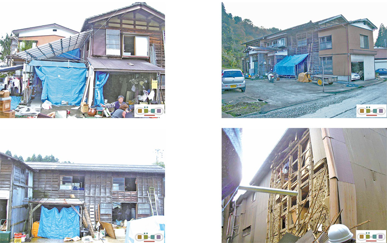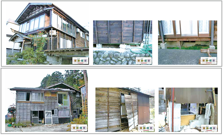 傾斜や壁のはがれ、基礎に亀裂がはいるなど建物のいたるところに被害があらわれる - 2004年新潟県中越地震