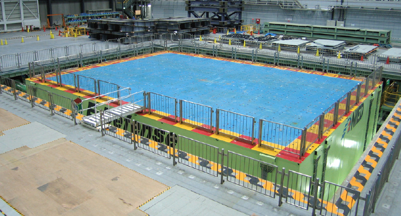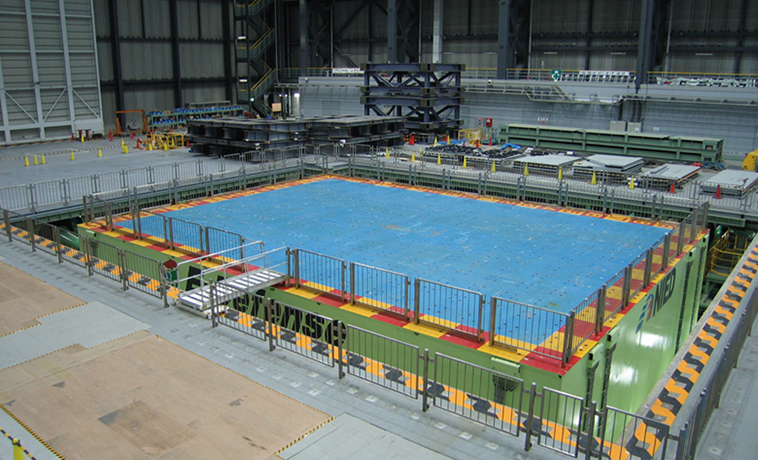 実大三次元震動破壊実験施設(愛称:E-ディフェンス)は、実大規模の建物(戸建2棟分、中層建物もそのまま)などに兵庫県南部地震クラスの地震の揺れを前後・左右・上下の三次元に直接与えることで、その揺れや損傷、崩壊の過程を詳細に検討できます。E-ディフェンスは構造物の耐震性向上に関わる研究開発と実践を促進する「究極の検証」手段です。